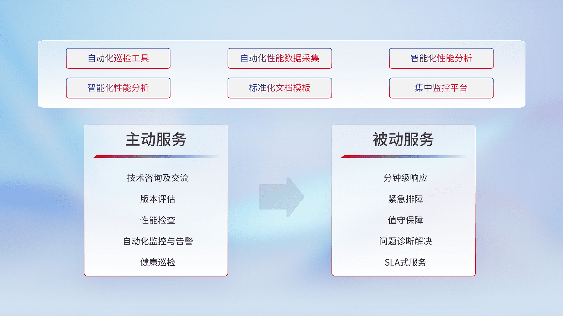 智能化工具和标准化文档,,,,保障服务质量,,,提供主动服务(包含技术咨询、、、、版本评估、、性能检查、、、、自动化监控与告警、、健康巡检)和被动服务包含(分钟级响应、、、紧急排障、、、、值守保障、、、问题诊断解决、、SLA服务)。。。。