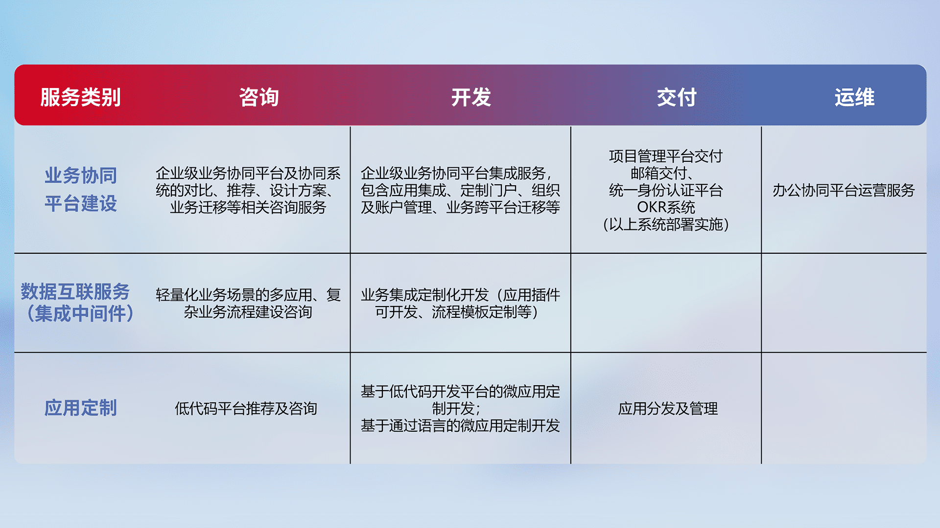 针对钉钉、、企微、、、、IDaas等平台级产品提供产品的规划、、方案、、、交付、、、、定制化开发等服务,,,,实现如统一协同办公、、智能客户服务、、、、混合会议管理、、、、智能数据查询、、、、等业务场景,,实现数字化转型。。